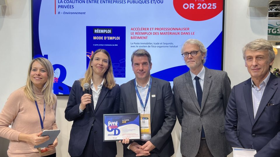 Le Grand Prix des Coalitions à Impact 2025 a été remis à La Poste Immobilier, Icade, Sequndo et Valobat pour leur alliance en faveur du réemploi des matériaux dans le bâtiment. Alors que secteur du bâtiment est le plus gros producteur de déchets avec plus de 46 millions de tonnes par an (selon la Fédération Française du Bâtiment (FFB)), ces quatre partenaires ont publié un premier guide pratique à destination des maîtres d’ouvrage, afin de fixer des pratiques standards et de déployer une méthodologie commune de déconstruction sélective en vue de généraliser la démarche de réemploi des matériaux de second-œuvre.