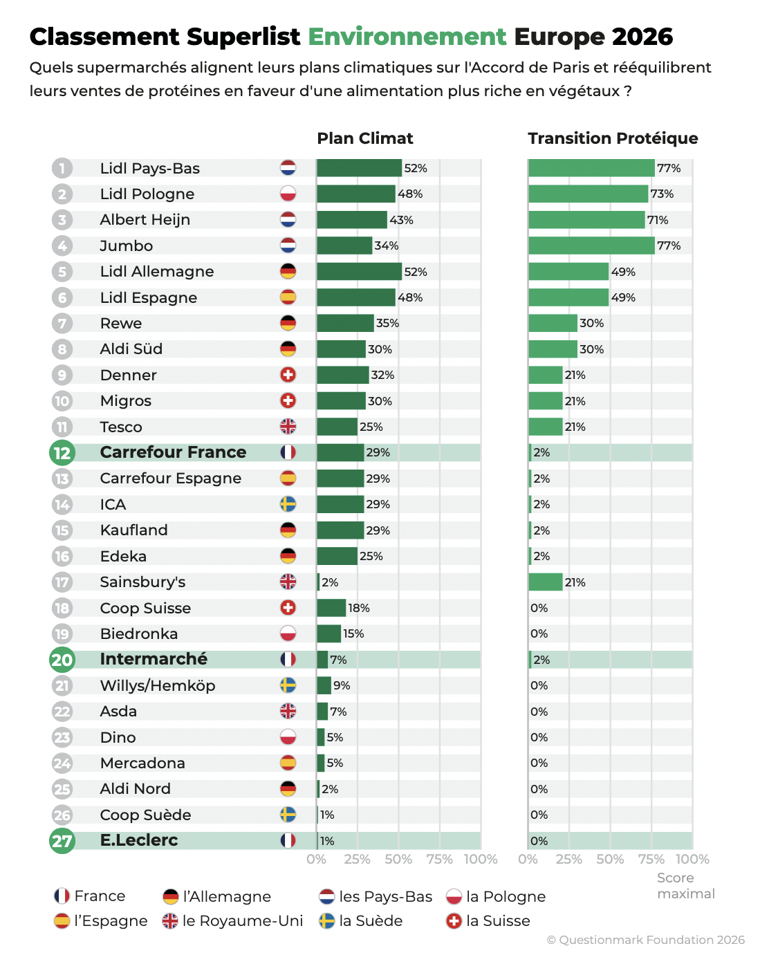 Le plan climat de Leclerc, en particulier, ne communique pas ses émissions de gaz à effet de serre et ne comprend aucune feuille de route affichant des objectifs de court-terme. Mais c’est surtout la faiblesse de leurs actions en faveur d’une alimentation plus riche en aliments végétaux de qualité et moins en protéines animales, qui pénalise les enseignes françaises.