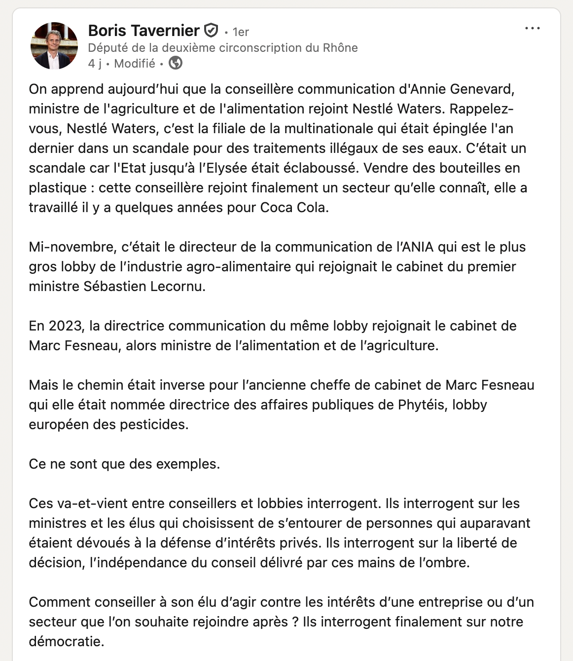 Particulièrement exposé à des scandales d’origine sanitaire ou liés à des autorisations contestées de recours à certains intrants, le secteur agro-alimentaire semble également très riche en exemples de « pantouflages ». C’est ce qu’a a rappelé le député Les Écologistes Boris Tavernier dans un post LinkedIn. Ce mouvement n’est que le dernier en date d’allers-retours entre ce ministère et plusieurs lobbies du secteur, notamment l’ANIA (Association nationale des industries agro-alimentaires) ou Phyteis, qui regroupe les industriels français de la filière phytopharmaceutique, autrement dit, des pesticides.