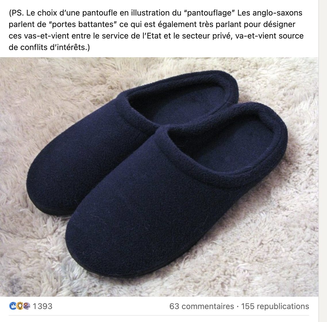 Stricto sensu, le terme « pantouflage », inspiré de l’argot de l’école Polytechnique, désigne le fait pour un haut fonctionnaire d’aller travailler dans une entreprise privée. Autrement dit, de préférer « la pantoufle » à « la botte », qui consiste à se mettre au service de l’État pendant au moins dix ans après l’obtention de son diplôme et de rembourser ainsi ses études.