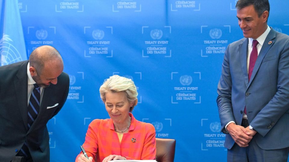 Photo : La Présidente de la Commission européenne, Ursula von der Leyen, signe le Traité sur la haute mer aux côtés de Pedro Sánchez, Premier ministre espagnol. (Commission européenne/DR)