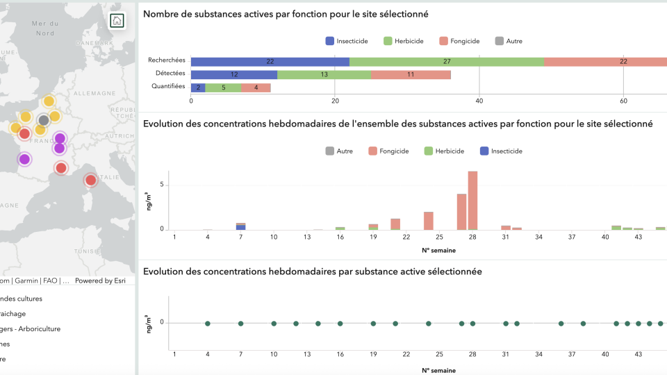 Les données portent sur la période 2022-2023 et concernent 72 substances actives. Environ un tiers apparaît dans les mesures. Une sur huit atteint des niveaux mesurables. Ces concentrations restent faibles, mais leur présence concerne l’ensemble du pays.